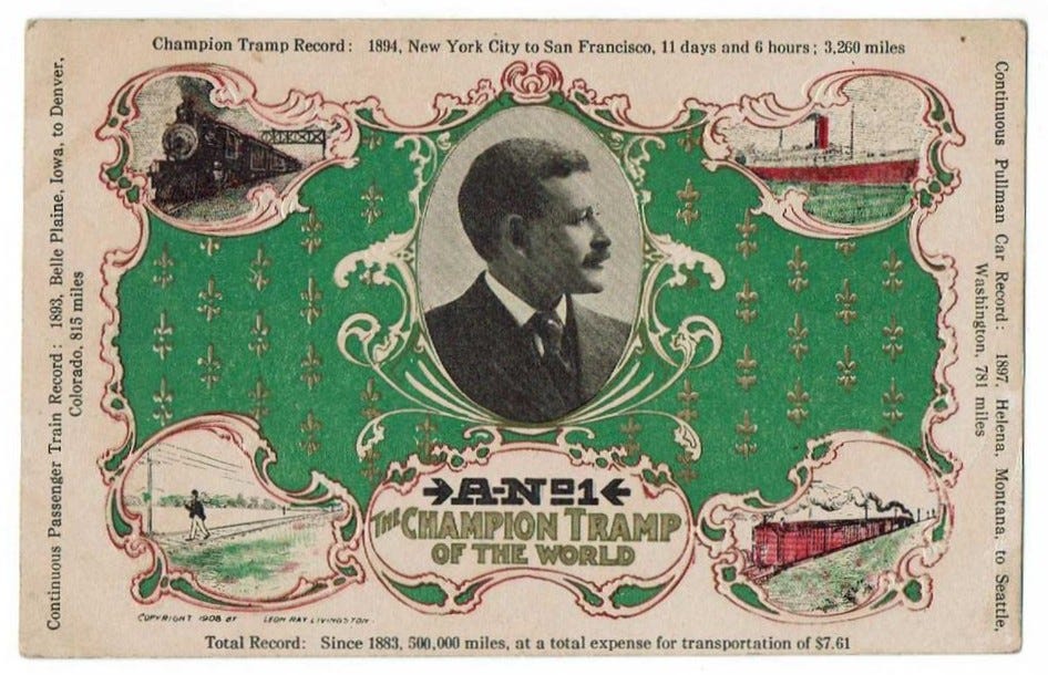 “ ‘Every tramp gives his kid a nickname, a name that will distinguish him from all other members of the craft,” Livingston recounted Frenchy’s words in his 1910 debut, Life and Adventures of A-No.-1: America's Most Celebrated Tramp. “ ‘You have been a good lad while you have been with me, in fact been always 'A-No. 1' in everything you had to do, and, Kid, take my advice, if you have to be anything in life, even if a tramp, try to be 'A-No. 1' all the time and in everything you undertake.’”